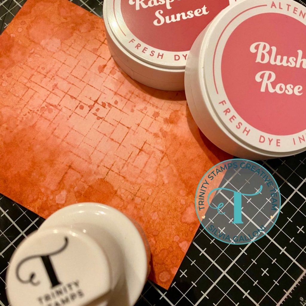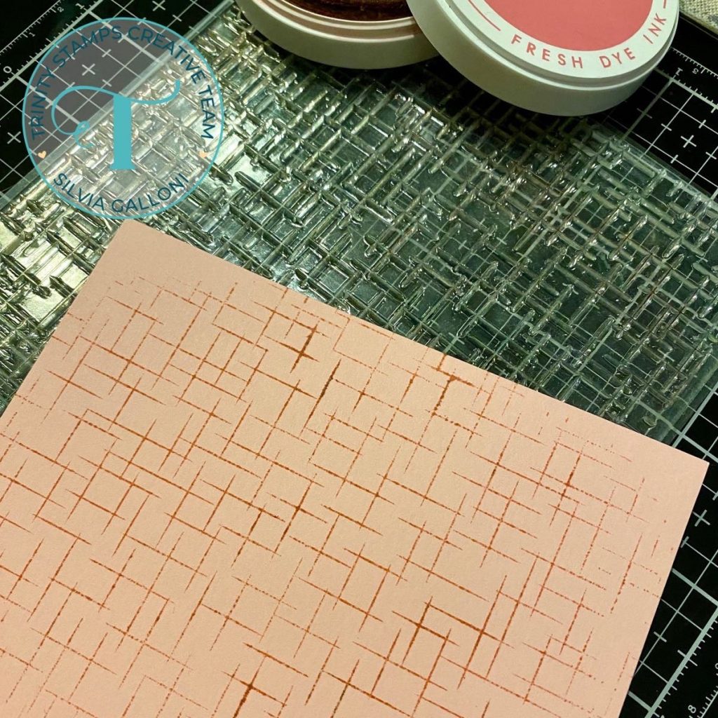 I started cutting a panel from a light pink cardstock and I stamped the “Abstract Scratch” background stamp on it with a dark pink dye ink.