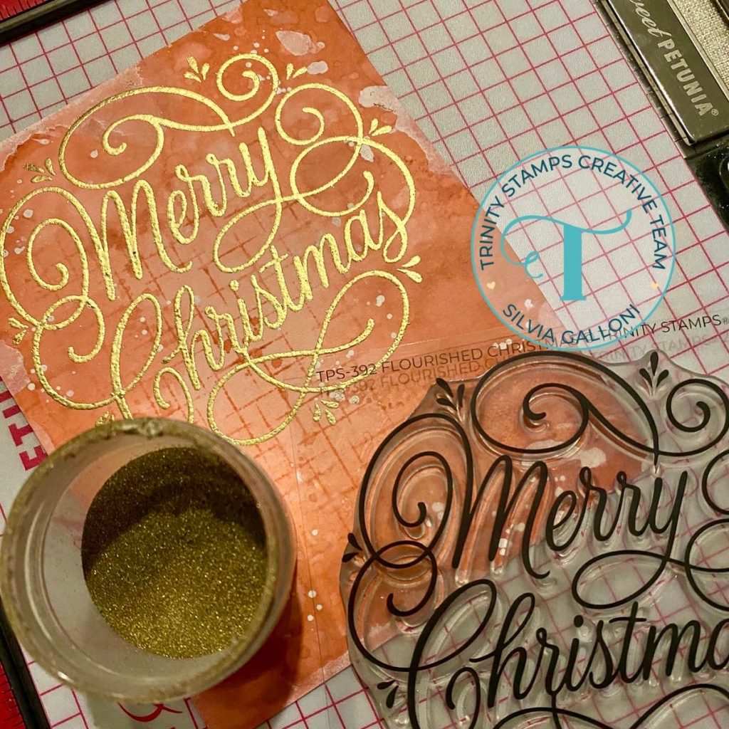 I heat embossed the beautiful “Flourished Christmas” stamp set on my card base in gold.