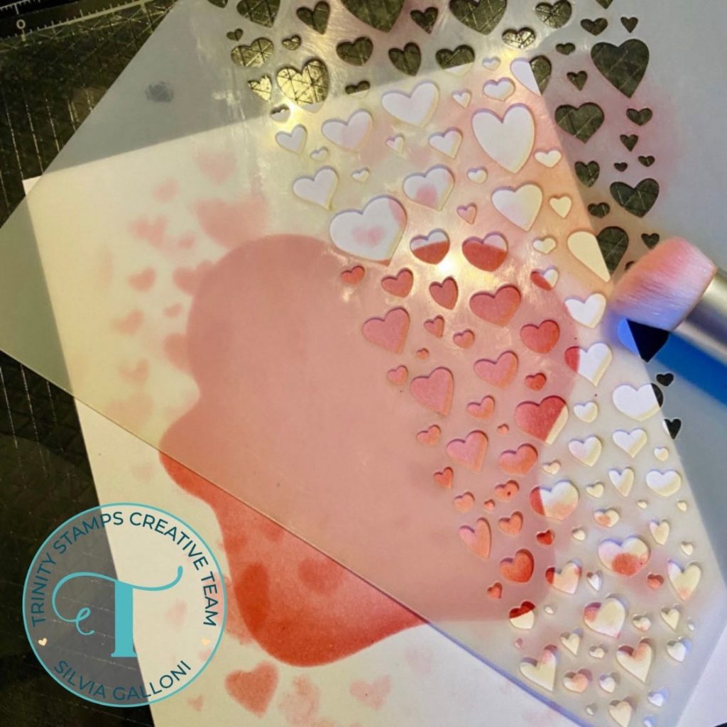 I then ink blended some hearts using the same inks and the new “Beaming With Love” stencil and the Clingy Craftmate.