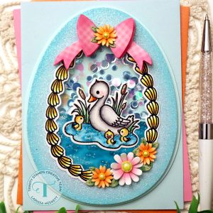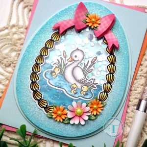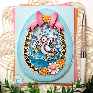 Then I Die Cut the Images out using the coordinating NEW Sugar Egg Builder Die Set!! I added some White Gel Pen Highlights as well as some Nuvo Iridescent Glitter Drops to the Water of the Main Image and the Water Cardstock that I adhered the Image to for the bottom of the Scene!! I LOVE the extra Iridescent Sparkle and Shine it adds to the Card!!