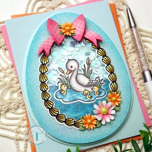 I Adhered my Acetate Window the back of the Oval Frosting Image and then I adhered the Turquoise Cardstock Lake and Image to the backside of the Frosting and Acetate Window Piece!! This way, the Shaker Embellishments will be Behind the Image and won’t distract from them, but you could totally create this with the Image on the bottom side of the Shaker too!! I’ve used the Polished Aquamarine Confetti and the Bokeh Flat Heart Confetti for my Shaker Embellishments!! It’s whatever Look you are going for!! Then I added my Foam Tape all the way around the Egg and behind the Lake leaving some space so the Embellishments can float behind the lake alittle!!