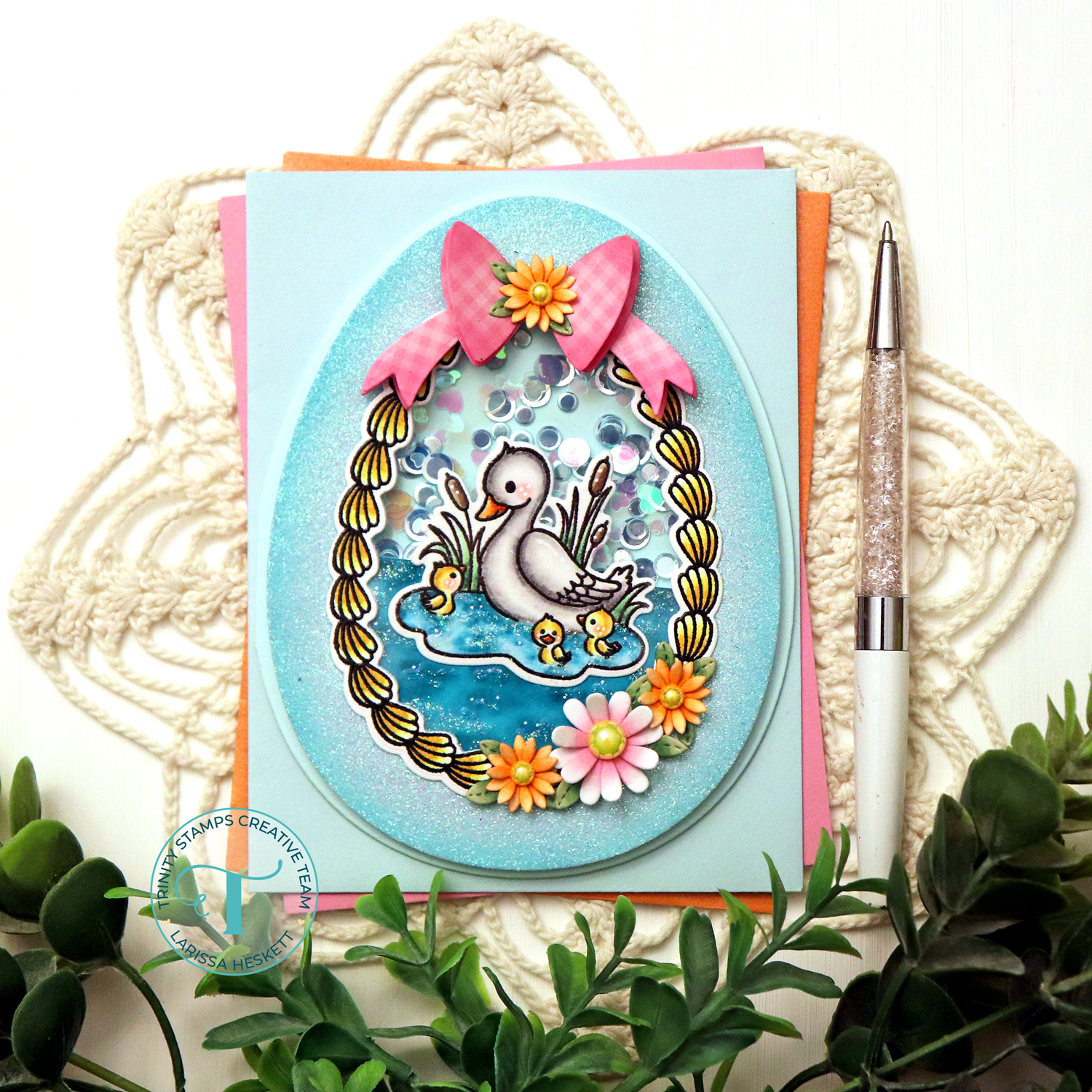 I Adhered my Acetate Window the back of the Oval Frosting Image and then I adhered the Turquoise Cardstock Lake and Image to the backside of the Frosting and Acetate Window Piece!! This way, the Shaker Embellishments will be Behind the Image and won’t distract from them, but you could totally create this with the Image on the bottom side of the Shaker too!! I’ve used the Polished Aquamarine Confetti and the Bokeh Flat Heart Confetti for my Shaker Embellishments!! It’s whatever Look you are going for!! Then I added my Foam Tape all the way around the Egg and behind the Lake leaving some space so the Embellishments can float behind the lake alittle!!