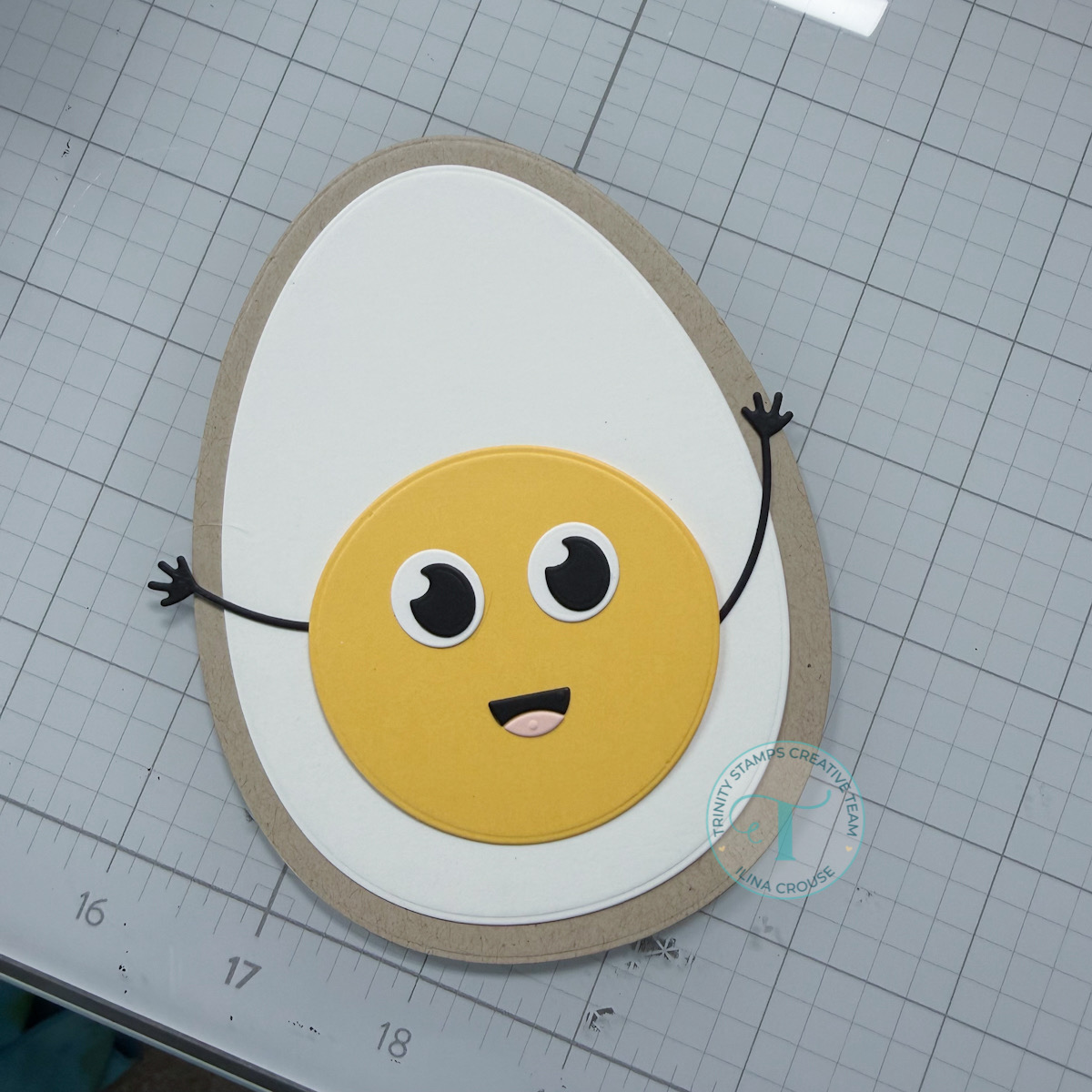 Adhere the entire egg to a Kraft base (for a brown egg) and then to the Kraft egg shaped card base! And you are done! You have super cute card!
