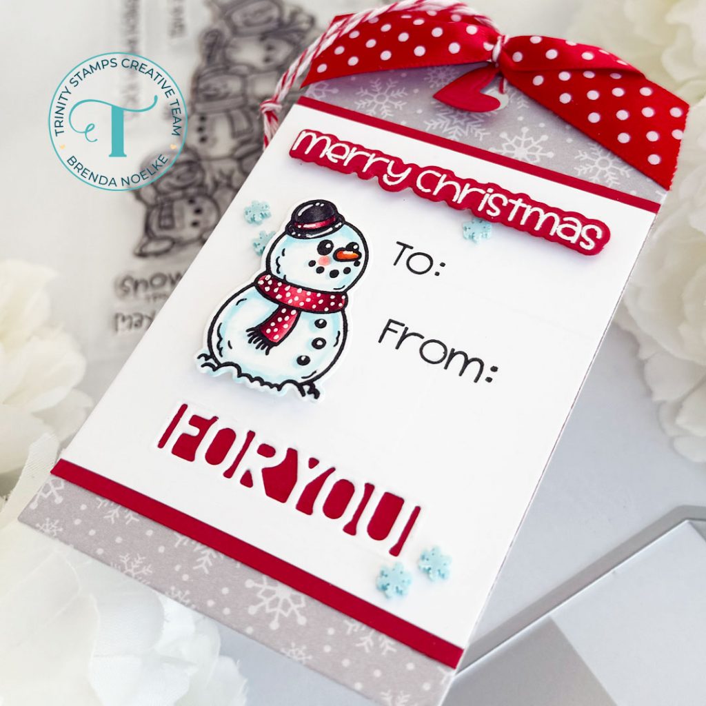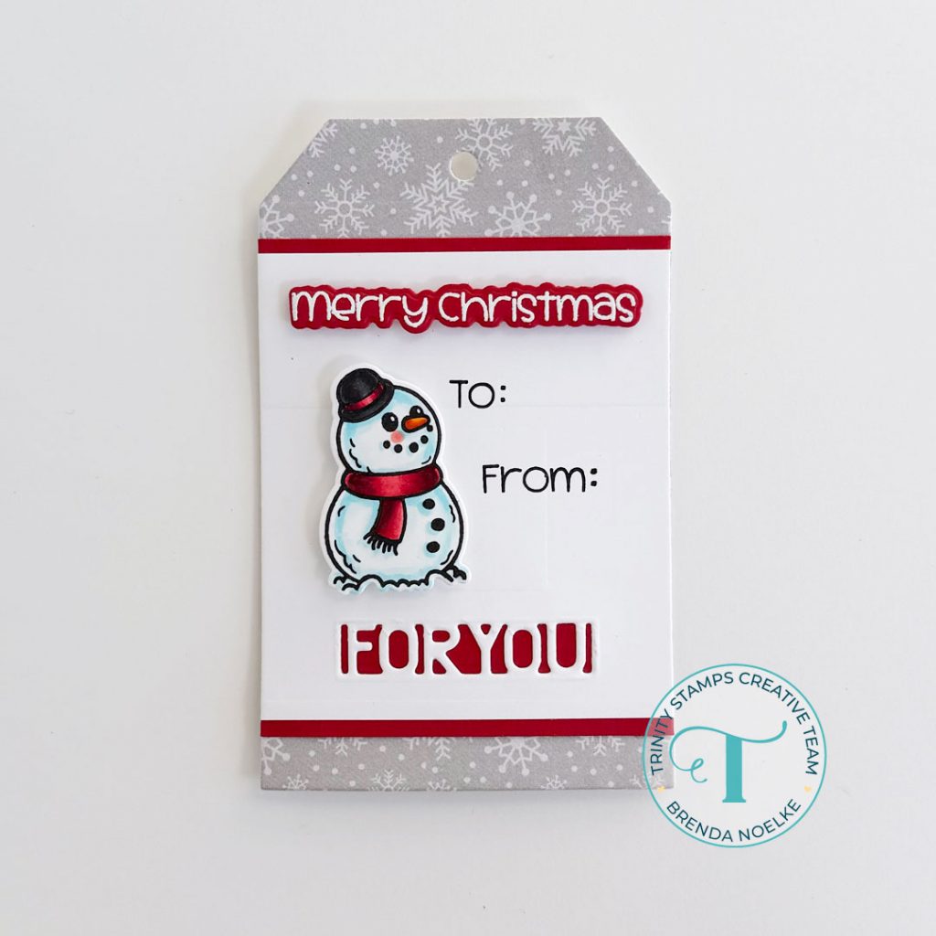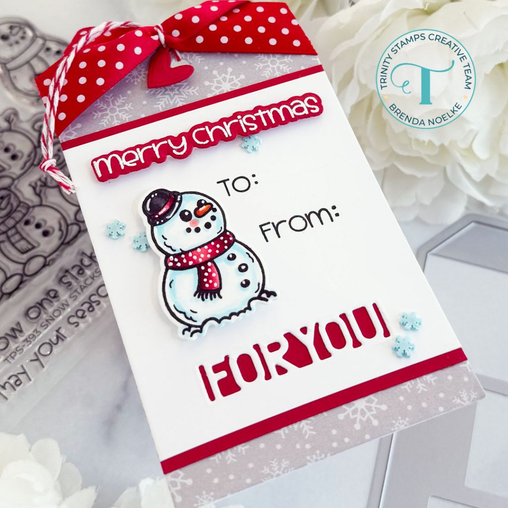 The sentiments are from the Holiday Gnome Stacks Stamp Set. “To: and From:” were stamped directly onto the tag with black pigment ink. “Merry Christmas” was stamped onto red cardstock with Versamark ink, embossed with white embossing powder, then cut out with the Coordinating Die.