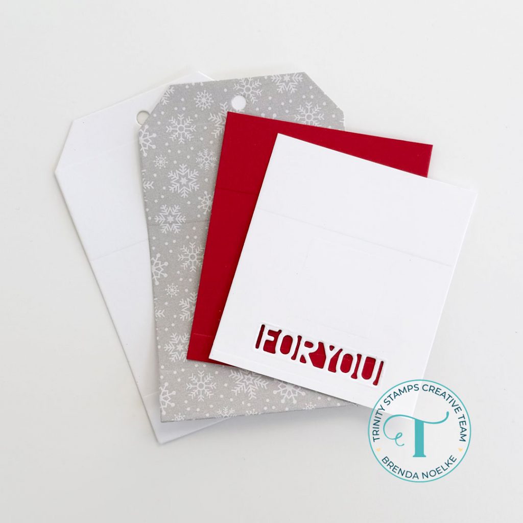 The Zip Gift Tag Die Set was used to create the tag. I die-cut the tag from gray snowflake patterned paper, heavyweight white cardstock and red cardstock. I also die-cut the tag again from white cardstock and die-cut the “for you” sentiment from the middle. I trimmed the top white panel down, then trimmed the red cardstock slightly larger. All of the tags were adhered with liquid glue, adding glue only on the sides and the bottom behind the red layer, creating a pocket for the gift card.