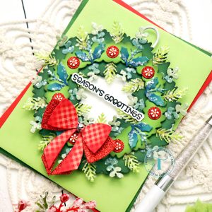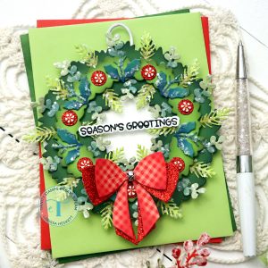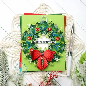 I Started by Die Cutting the Pieced for the Wreath using the NEW Holiday Wreath Circle Card Add-on Die Set!! I used different Colors of Green Cardstock and then Inked with Distress Oxide Inks!! Then to add even more texture and sparkle I added some Rock Candy Chunky Glitter and I LOVE the way it looks!! You could omit this step if Glitter isn’t your thing, or use Embossing Glitter which would be an equally BEAUTIFUL Option!!