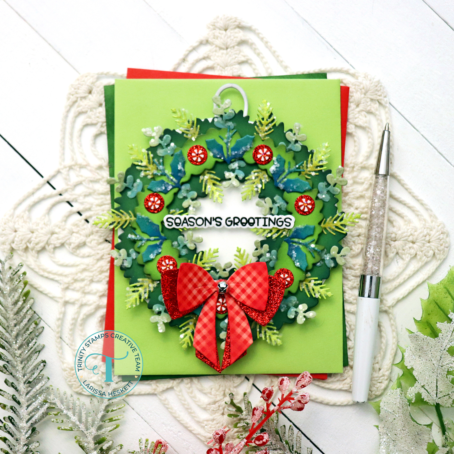 Lastly I Stamped and Embossed the Sentiment “Season’s Greetings” from the Little Tree Gnome Stamp Set using Versa Fine Black Onyx Ink and WoW Clear Gloss Embossing Powder!! I Die Cut the Sentiment out using the coordinating Little Tree Gnome Die Set and adhered it to the center of the Wreath!!