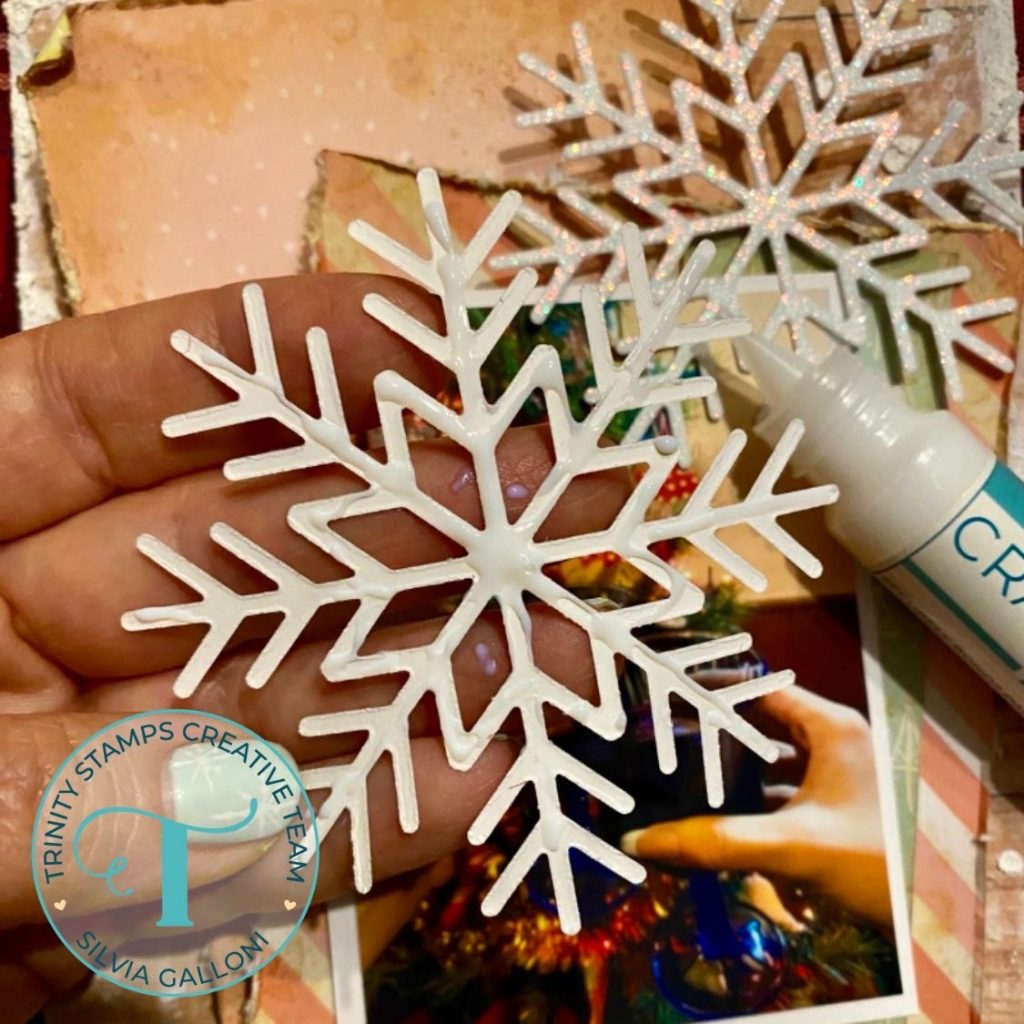 I first cut four snowflake using the “Big Snowflake Cut & Foil” set, twice from vellum, one from white cardstock and one from white glittered cardstock, and I glued them on the page with liquid glue.