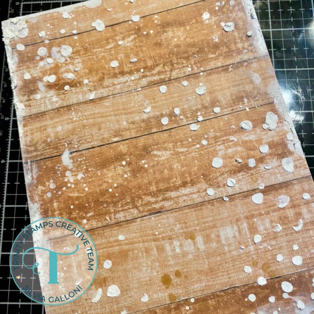 I then applied white Distress grit paste through the “Snowfall” stencil and I added a bit of it on the edges with my fingers.