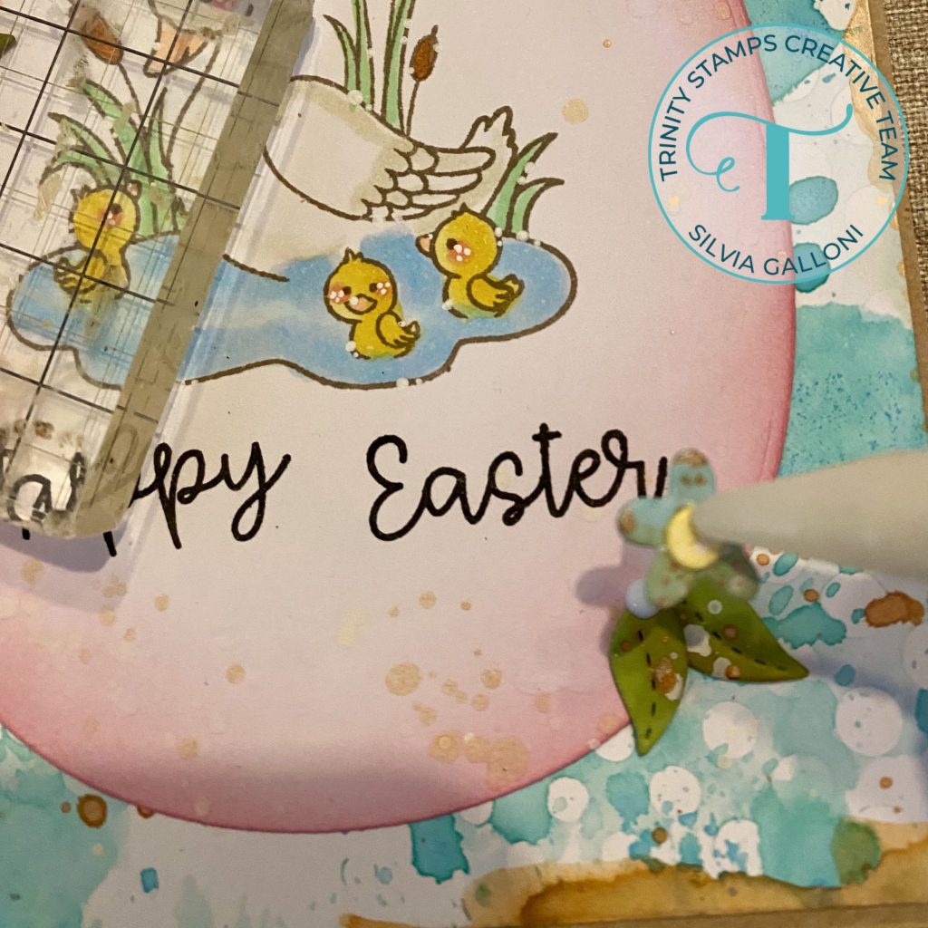 Then I die cut a Easter egg silhouette from white alcohol friendly cardstock with the smallest die from the “Sugar Egg Builder” coordinating die set and I stamped the beautiful images from the “Sugar Egg Builder” stamp set in the middle of it with ground espresso Distress archival ink .
