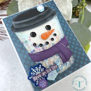 Use the Coffee On The Go Die set to cut a cup shape into your card front panel and turn it into a shaker card. Then use the Polar Pals die set to dress it up as a snowman.