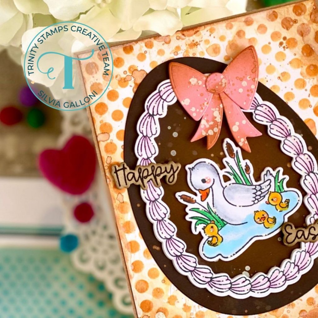 I stamped the beautiful images from the “Sugar Egg Builder” stamp set, I colored them with alcohol markers and I cut them with coordinating dies. I also die cut a big pink bow from the “Easter Basket Add-on” die set, I darkened edges with vintage photo Distress Oxide ink, I splattered with white and gold acrylic paints and I put everything together with liquid glue.