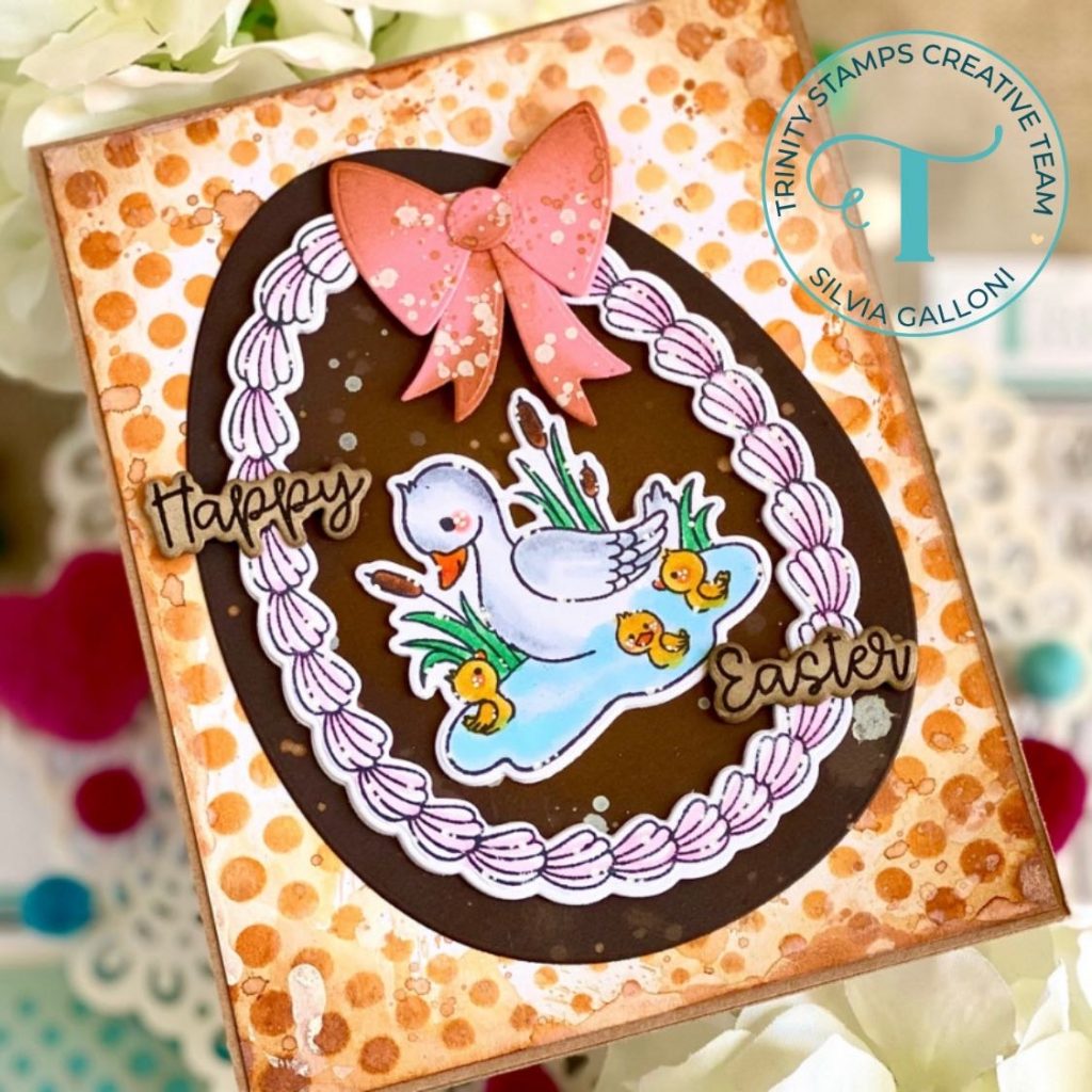 I then used the “Sugar Egg Builder” coordinating dies to cut a “chocolate egg” from brown cardstock, I darkened eges with ground espresso Distress Oxide ink and I splattered with clean water and white and gold acrylic paints.