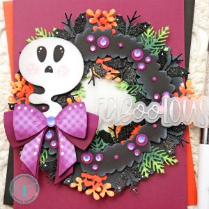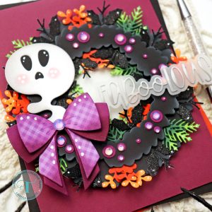 Then I added the Purple Ornaments to the Smaller Inner Black Wreath Piece and added some Sugar Plum Dance Glass Rhinestones to the center of the Ornaments for some Dimension and Sparkle!! Then I adhered the Ghost and Bow also to the Smaller Inner Black Wreath Piece with some Foam Tape for some Dimension!!