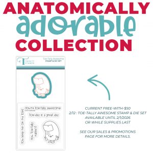 Remember when you are shopping that the February Anatomically Adorable Stamp and Die combo is still available as a FREE GIFT with purchase. This month we are bringing you Toe-Tally Awesome. This cute little toe can also be used as a thumb! You’ll find inspiration with this set on our Instagram page
