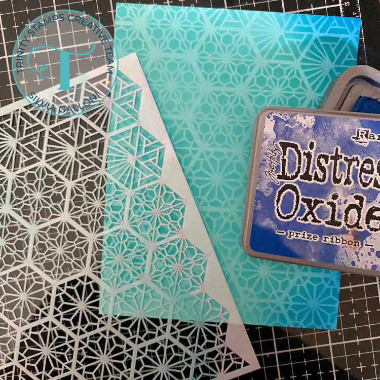 I started cutting a 5,5″x4,25″ panel from turquoise cardstock and I ink blended it with the fantastic “Tomodachi” stencil and peacock feathers Distress Oxide ink.