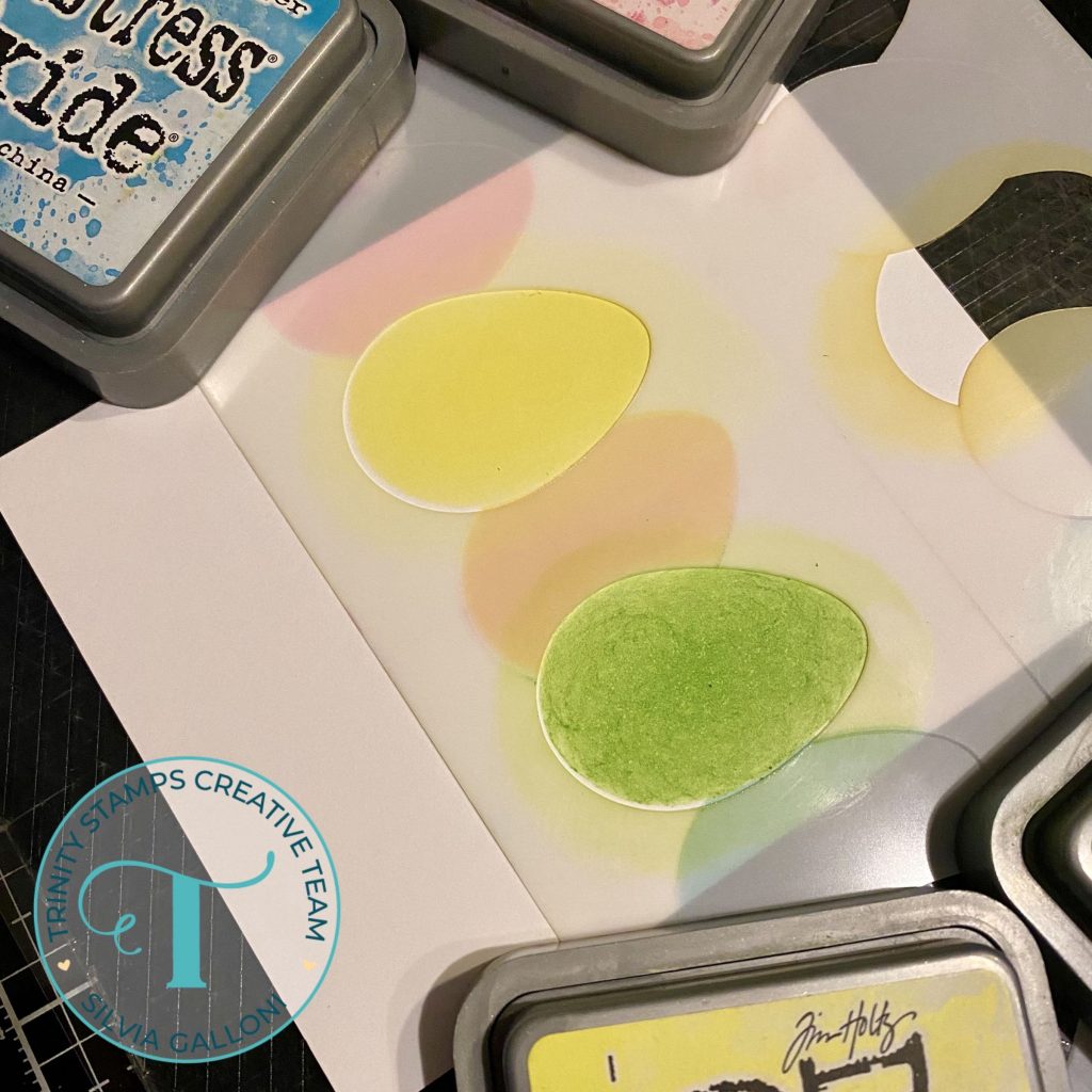 I started cutting a 5,5″x4,25″ panel from white cardstock and I colored it appling kitsch flamingo, carved pumpkin, squeeze lemonade, mowed lawn, broken china and wilted violet Distress Oxide inks through the “Layered Eggs” stencil with the amazing “Clingy Craftmate”.