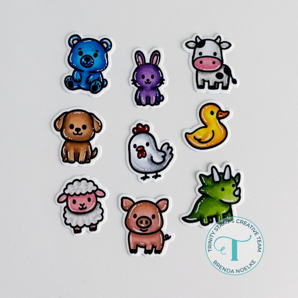 I started by stamping the cute critters in the Stuffies Stamp Set with Copic-friendly black ink. I colored them with Copic markers, added highlights with a white gel pen, then used the Coordinating Dies to cut them out.