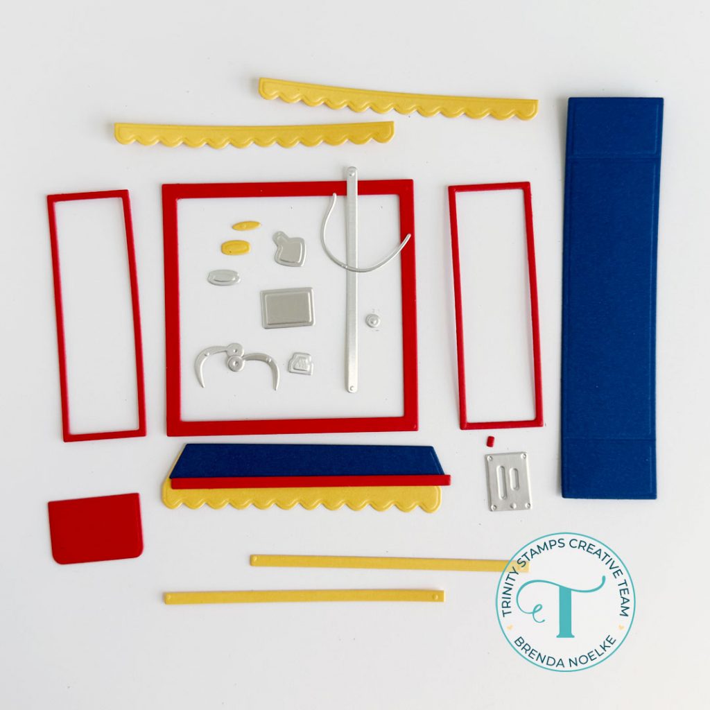 All the parts for the gashapon machine were cut from blue, red, yellow and frosted silver cardstock using the Gashapon Machine Die Set.