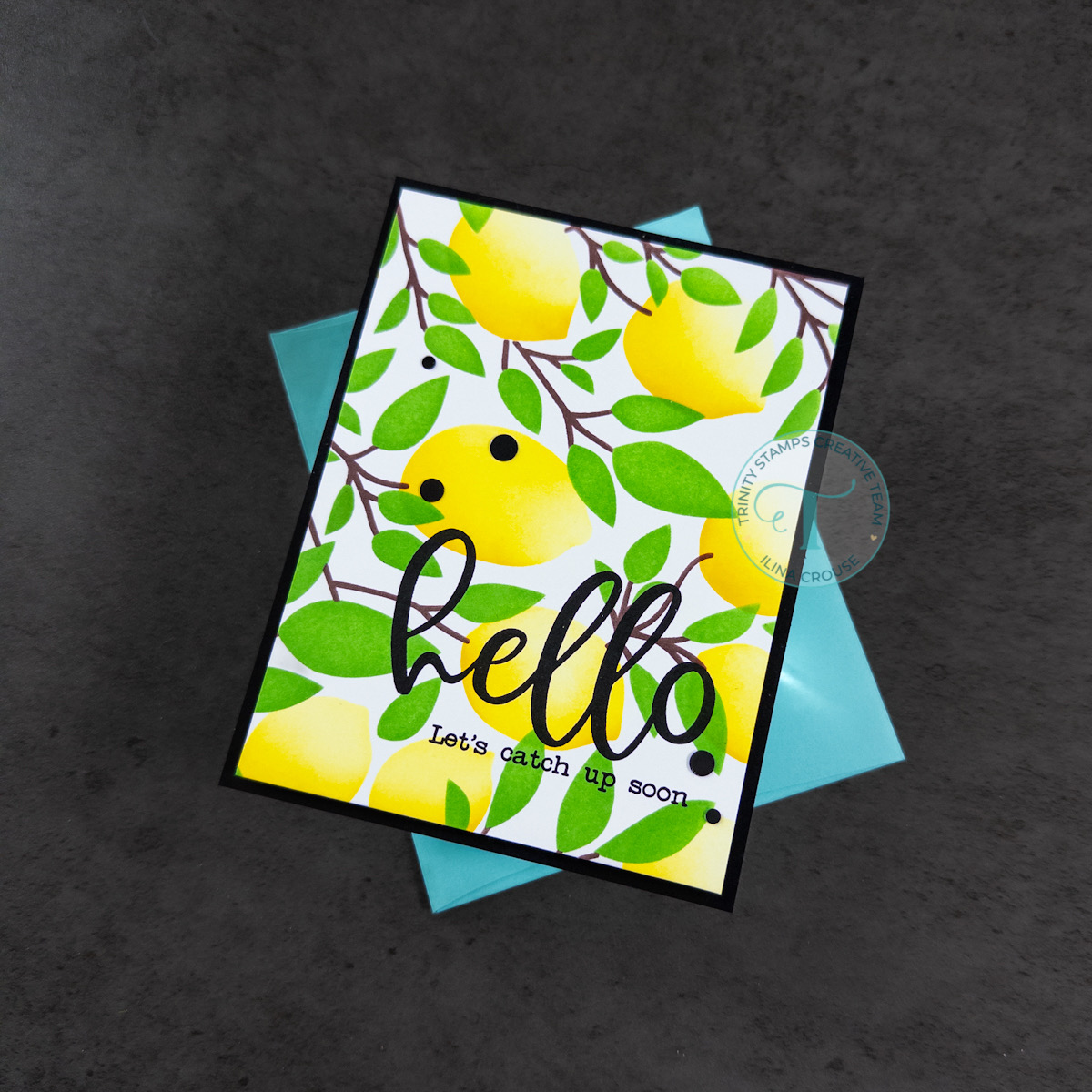 Ilina here! Today I am sharing a card fit for everyday occassions, using an older and favorite of mine stencil set, Lemons and Leaves. This stencil set is 6×9 and it’s layering. Those are my favorite, as you can end up making two cards or more with one stenciled background. However, I just made one.