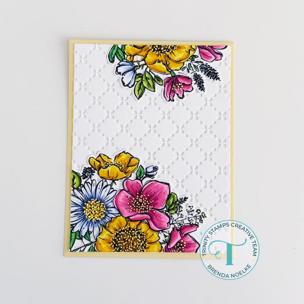 Next, I stamped the Sketchy Florals Stamp Set with Copic-friendly black ink and colored it with Copic markers, then cut it out with the Coordinating Die. I added dots to the centers of the flowers with a yellow gel pen. The floral was cut and adhered to the top and bottom of the panel with liquid glue.