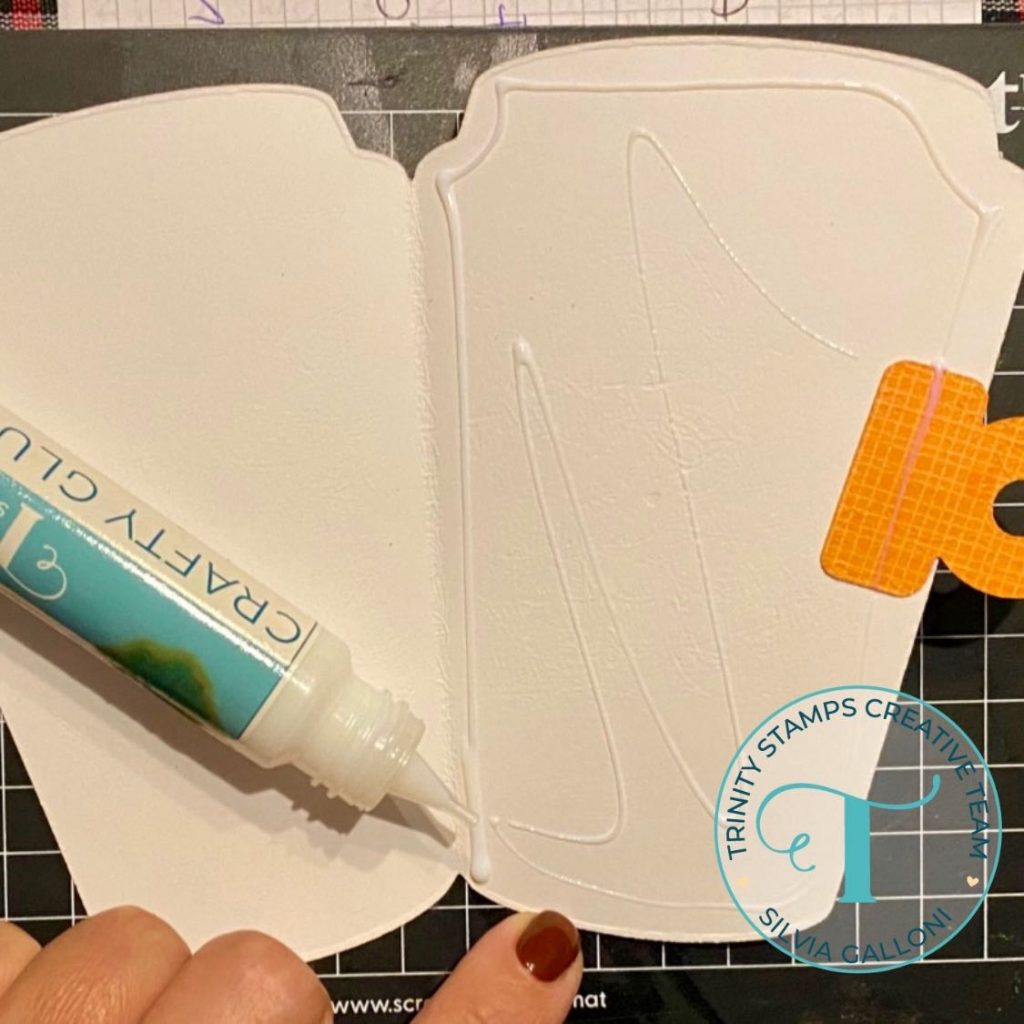 I cut 5 bases from white cardstock using the “Take.out Coffee Cup Shaped Card” die set, I folded them in the half, I put the tabs inside and I glued them together to get sturdy pages. I darkened edges with vintage photo Dsitress Oxide ink and I set them aside.