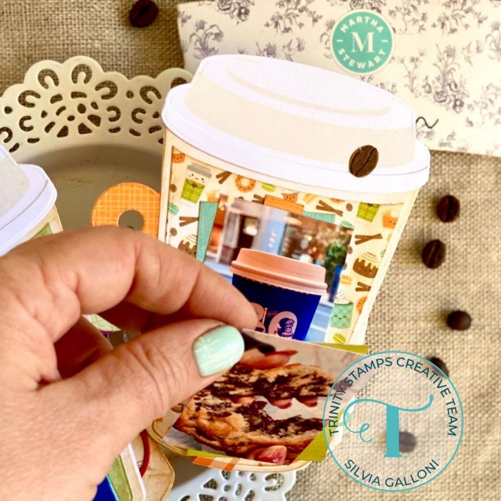 I then used the “Coffee on the Go” die set to cut the cup bodies from patterned papers, I darkened them with Distress vintage photo and I glued them on the bases with liquid glue.