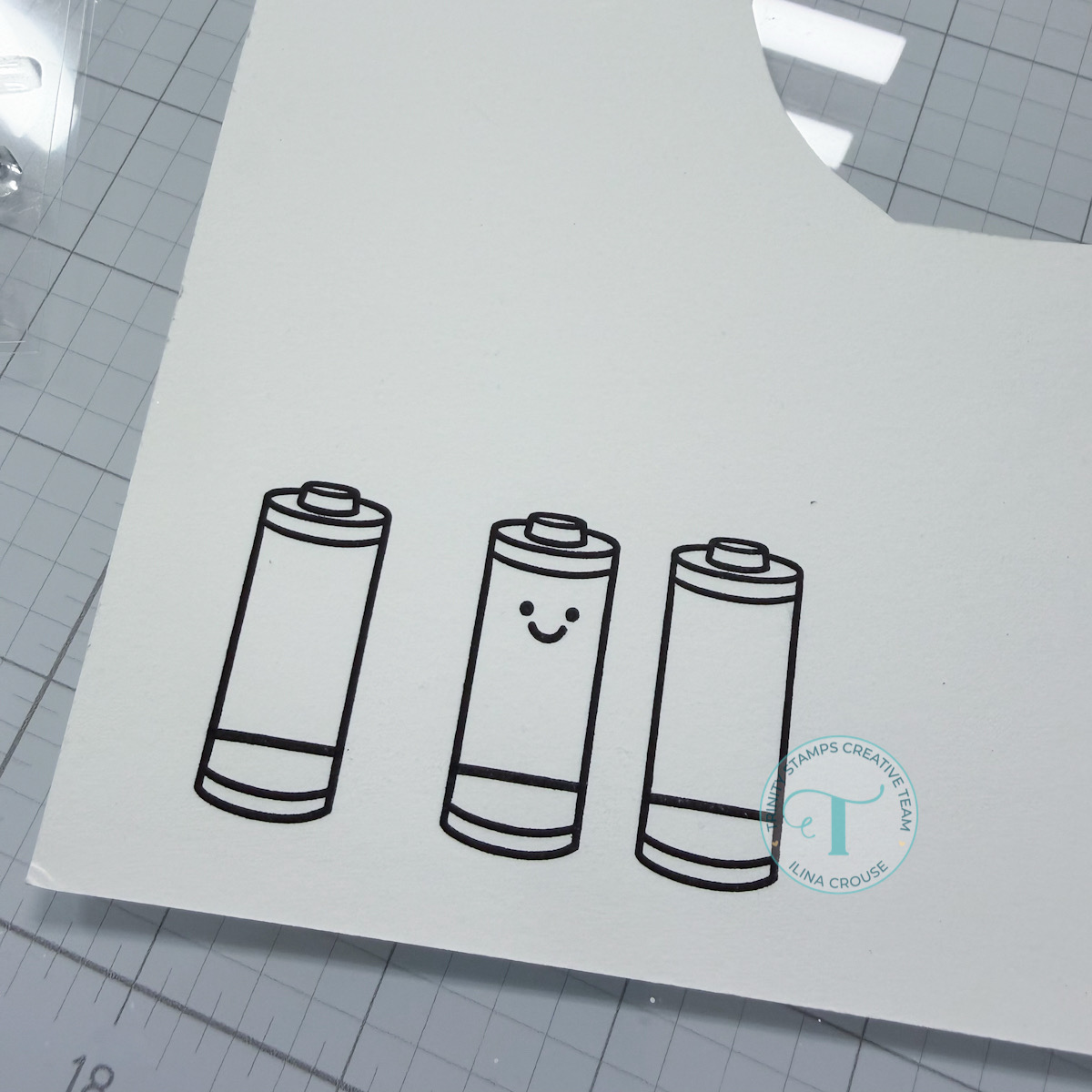 To make the card, start by stamping the batteries on watercolor paper (I used hot press) with black waterproof ink. Stamp the smiley face on one and also the level of charge lines towards the bottom. I used the larger line stamp and masked the sides of the stamped batteries.
