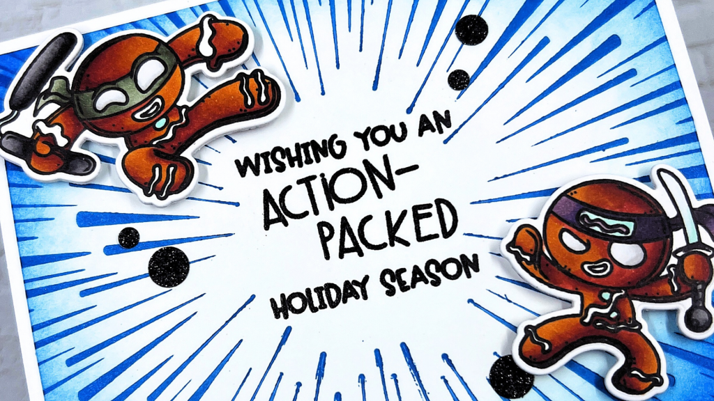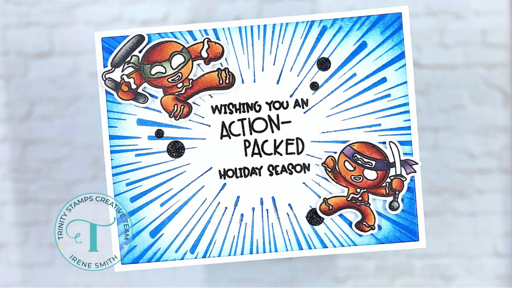 Hi, friends! Irene here with ArtemisMade1, and as always, I’m so excited to be back on the Trinity blog and sharing another card and video tutorial with you! This particular holiday card is kicking up some Christmas cheer–literally! In today’s tutorial, I’m using the Ninja-Bread Man stamps & dies along with the Time Warp Letterpress Stamping Die to create an action-packed background that’s full of motion and energy. Watch how these sweet but mighty ginger ninjas leap into your holiday cardmaking lineup with some clever coloring, inky blending, and a touch of sparkle! Perfect for anyone who loves a little pun and a lot of fun.