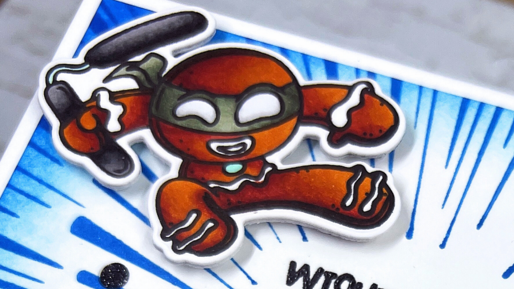 I wasn’t sure at first how best to color these little cuties, but I ended up loving the final result! I used Copic markers in E19, E09, E08, and my secret weapon YR27 for that warm ginger glow. I also went with a blend of V99, BV08, and V95 for the eggplant bandana on the right, but I first did an underlayer of V95 and then topped all the blending off with a layer of W5, both of which cooled down the BV08 since that color came in HOT! lol For my little “ginja” on the right I used T10, T8, T6, and T4 for his nunchuks and BG99, BG96, and BG93 to get that dark sage green. On both “ginjas” I used a light blend of BG11, BG10, and BG0000 for a minty sage tone on the buttons–and yes, before you ask, about every 5 minutes I would say to myself, “Not the gum drop buttons!!” #IYKYK 😂