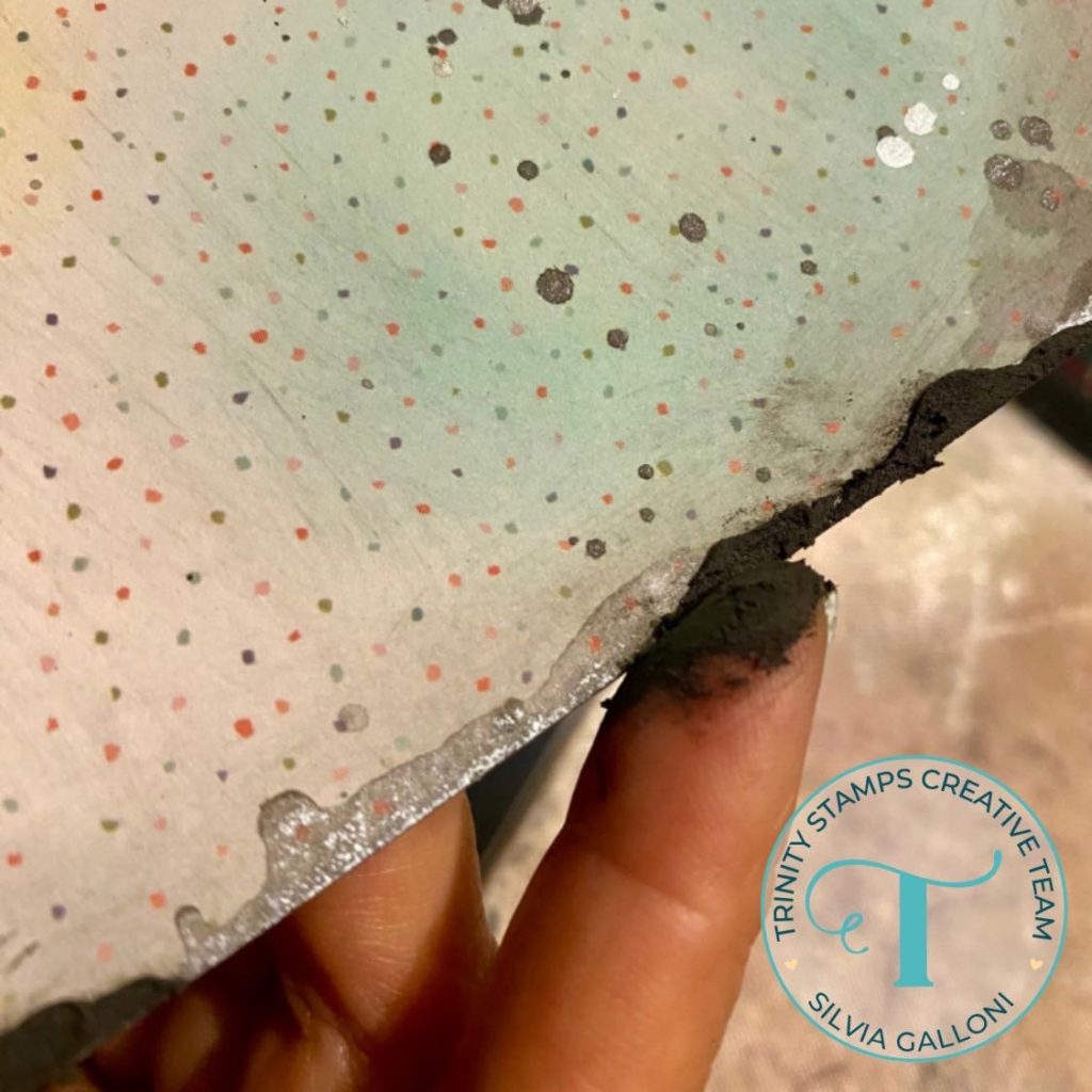 I darkened edges with black soot Distress Oxide ink, I splattered with black and silver acrylic paint and I applied some black Distress texture paste on the edges with my fingers.