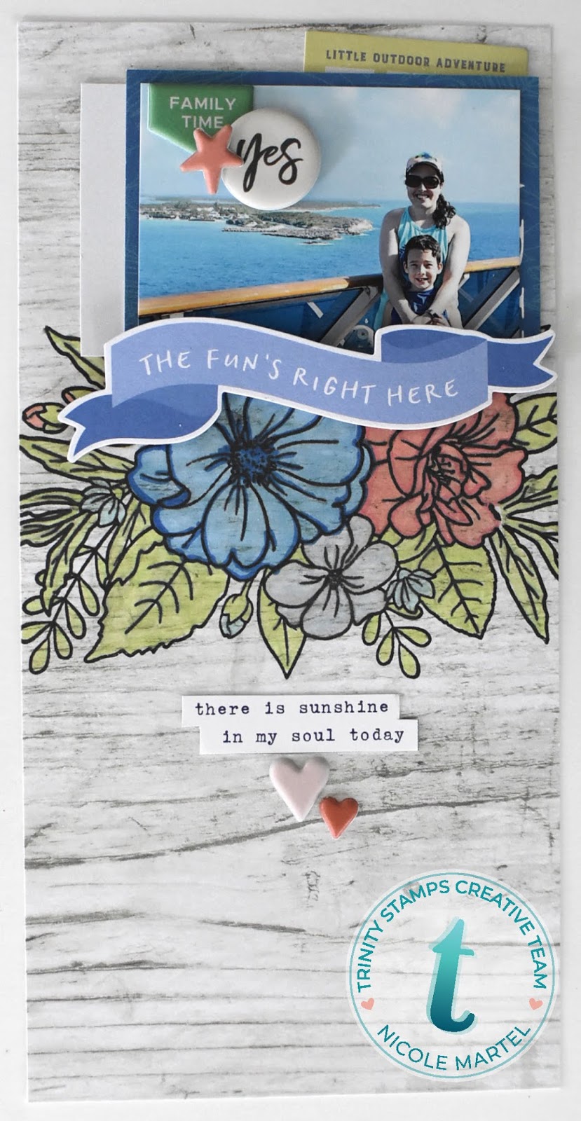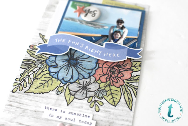 To complete the spread, I added a few sentiments and embellishments here and there. I wanted to keep it simple, focusing on the photos and cluster of flowers!