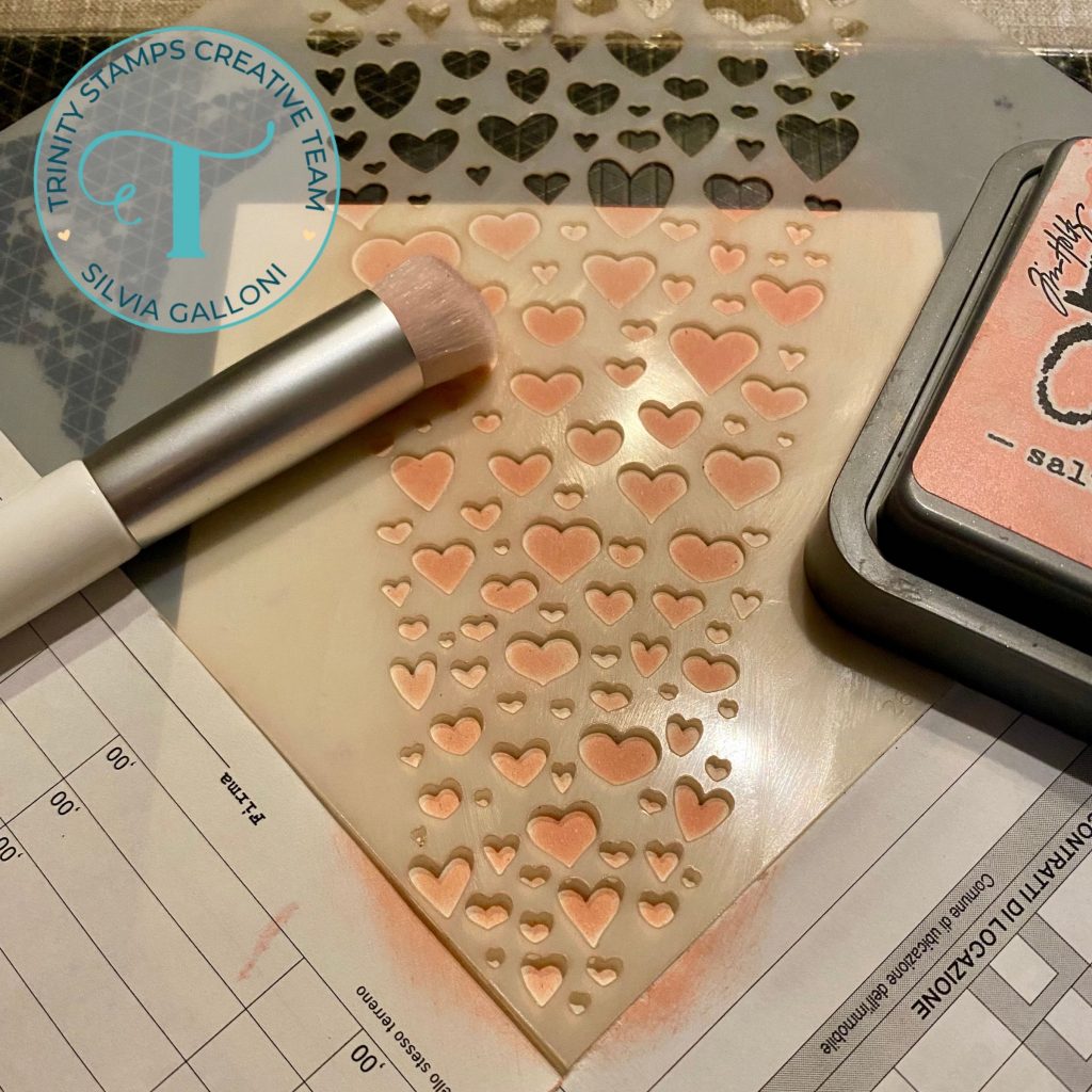 I started cutting a panel from white cardstock and I created an inky background on it using the new “Beaming with Love” stencil.