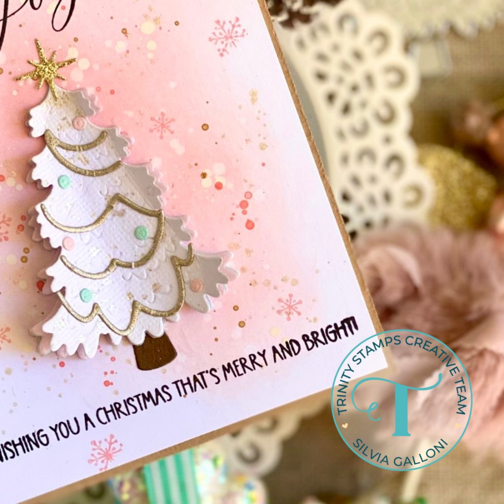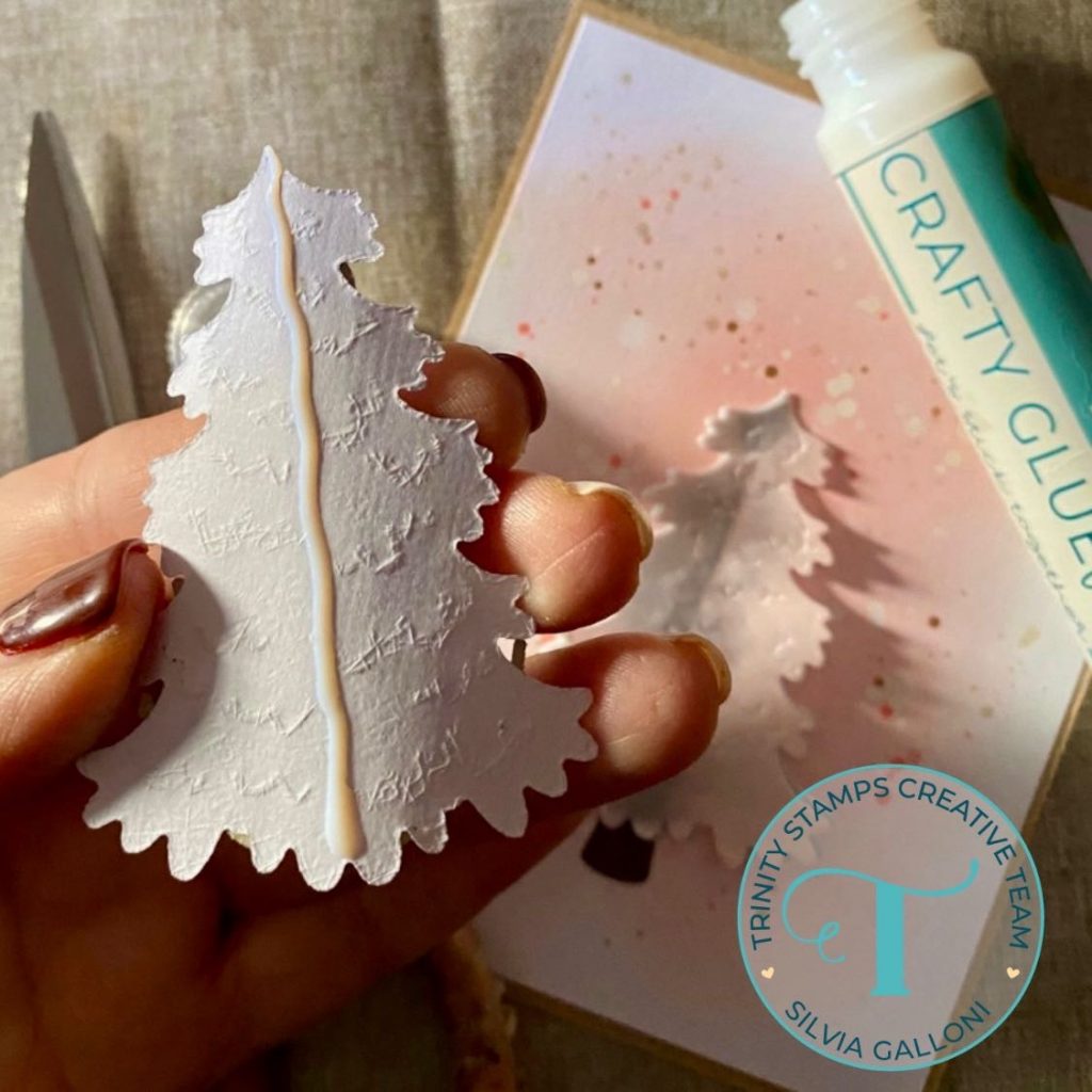 I die cut other two trees, one from light blue pastel vellum and one from pink pastel vellum, and I fold all of them in the middle. I glued one of the white tree on the inky base of the card and I decorated the other one with tinsel and christmas balls and I glued the other trees in the middle one above the other.