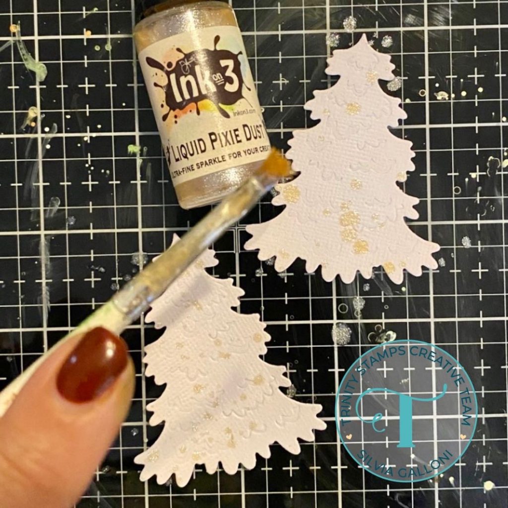 I then die cut two Christmas trees from white cardstock with the ” Tiny Christmas Tree” die set and I splattered them with liquid pixie dust.