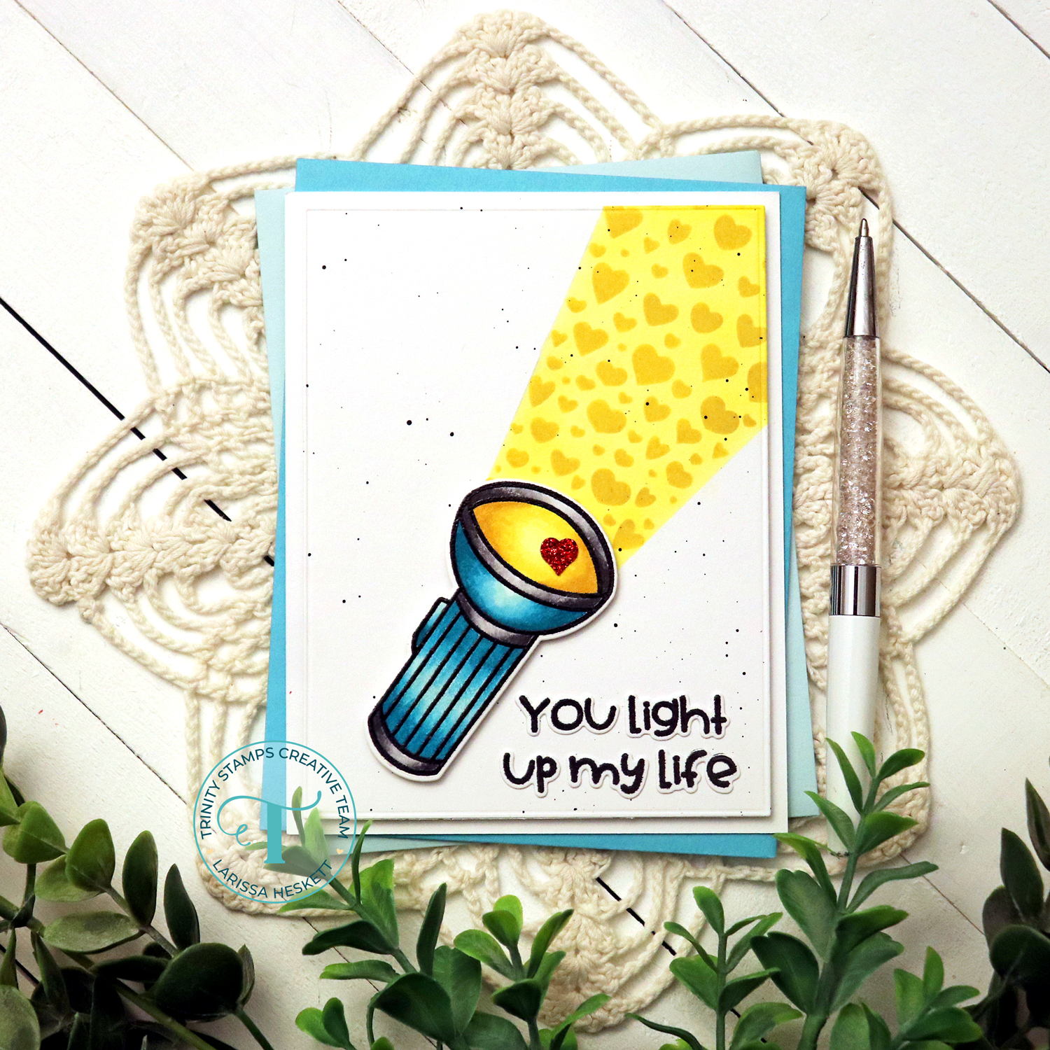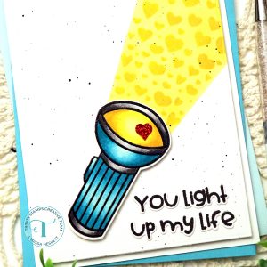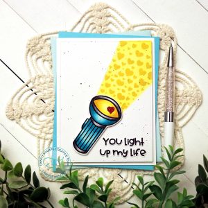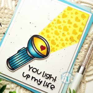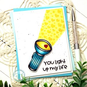 I Stamped and Embossed the “You Light Up My Life” Sentiment from the NEW Recharge Stamp Set using Versa Fine Black Onyx Ink and WoW Clear Gloss Embossing Powder and then used the coordinating NEW Recharge Die Set!! I adhered it to the Card Panel!! Then I adhered a Red Sparkle Hearts Confetti to the center of the Light and adhered the Flashlight using some Foam Tape for some Dimension!!