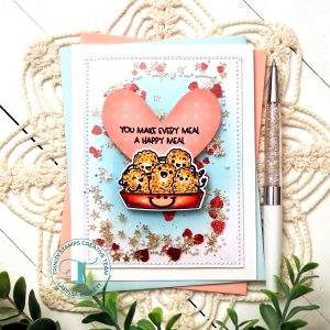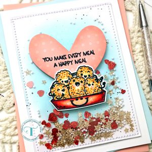 Larissa here today to share a FUN Happy Meal Shaker Card using the NEW Nugs & Kisses Stamp Set and coordinating NEW Nugs & Kisses Die Set!! This set is so FUN and can be used for so many Occasions!! I hope this Card Inspires you and makes you SMILE!! I KNOW the recipient will definitely be SMILING after they receive this Shaker Card!!
