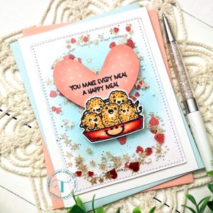 I Die Cut the Heart from some Patterned Paper using the Nested Hearts Die Set!! Then I Inked the Heart with some Kitsch Flamingo Distress Oxide Ink!! I added some Foam Tape for some dimension and I added the Inked Heart to the Shaker Panel!! I then adhered the Image and Sentiment to the Heart also using Foam Tape for Dimension!! I LOVE how this turned out and the Colors that I used!!